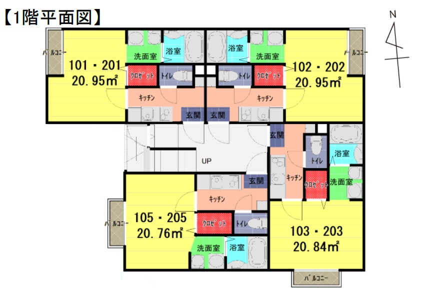 このシリーズは入居付けまで考えた間取りで建築しており各戸20㎡超の1Kが基本となっています。